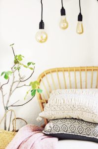 Gillar att göra små myshörn hemma. Små läshörnor eller bara ett litet myshörn som blickfång. Det blir ju så mycket mysigare med bra belysning. Jag har en hel del retroglödlampor hemma. De hänger lite här och var. På nästa bild ser ni en liten titt in i vår källare som tidigare varit skomakeri men som vi numera gjort om till ett Spa. Lamporna hänger i olika höjder mot en putsad vägg.