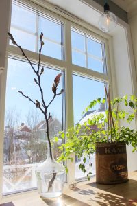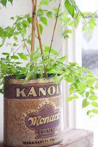 Gillar att ha växter i gamla sockerlådor och gamla plåtburkar som jag hittat på loppis. Det här är en gammal kakaoburk som jag fyndade billigt. Bredvid står en magnoliakvist och väntar på att slå ut. Bara älskar Magnolia och har planer på att plantera ett till sådant träd i trädgården till försommaren. Vi har en vit Magnolia men den har inte riktigt tagit fart ännu.