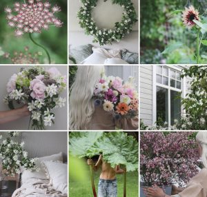 Titta vilka stora rabarber vi fick i år! En andra skörd är redan klar. På bilderna kan ni också se kransbindning som jag älskar. Den stora kransen ovanför vår säng har jag bundit av schersmin. Blomstermorot, puderrosa solrosor, pioner, ginst och dahlia. Finns så många skatter i trädgården.