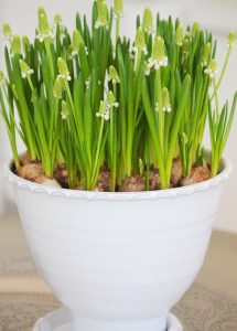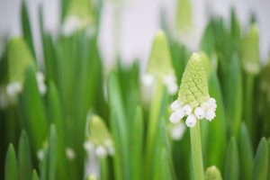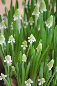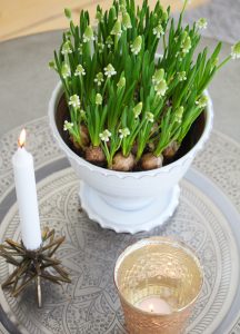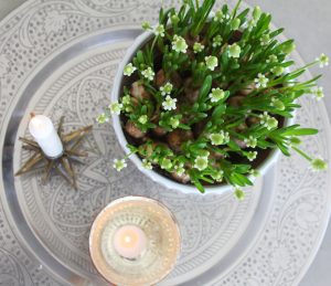 Redan efter nyår brukar jag ha lökar inomhus. Tycker det är så härligt att följa de små lökarna med sina gröna små strån tills de är blommande vårblommor. Lökar brukar jag köpa billigt på Ikea. Dessa små vita pärlhyacinter står i en kruka från Sturehofs Krukmakeri. De är alltid fina tycker jag och finns i enbart lera samt glaserade i olika färger. Min är vit och har hängt med i flera år nu. Efter blomning brukar jag spara mina små lökar och peta ner dem i rabatten sedan när våren är här på riktigt.