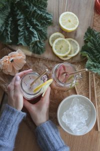Papperssugrör, citronskiva på kanten av glaset eller en rabarberspiral. Rabarberspiralen har jag gjort av rabarberskal som jag snurrat runt en cylinder och haft i frysen.
