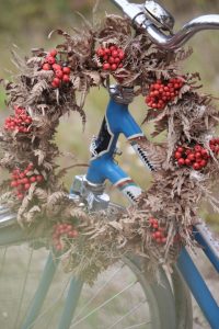 Krans från dikeskanten gjord av ormbunkar, gräs, rallarros och rönnbär.