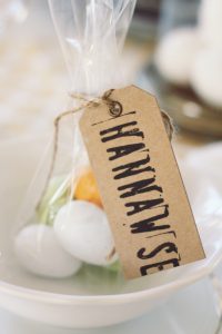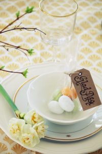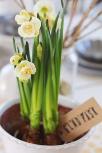 En liten prasslig cellofanpåse med marsipanägg blir en rolig present till gästerna och jag har pyntat assietterna med en enkel Tazett som jag köpte som lök i kruka. Lökarna gräver jag ner i rabatten eller intill husväggen så blommar de vackert till nästa år. Den vackra glaskupan med ägg kommer från H&M Home och likaså duken. De små paketetiketterna är från Lagerhaus och den ena har tryckta bokstäver med stämplar. Tänkte jag skulle visa er det i ett senare inlägg under påsklovet. Håll utkik så kommer det två delar till med påskdukningar.