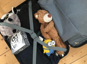Love packade sin väska helt själv. Ni ser ju vad som var viktigast att ta med och säkerhetsbälten skulle de ha 😀!
