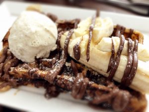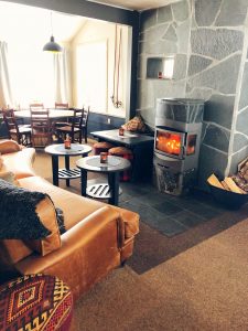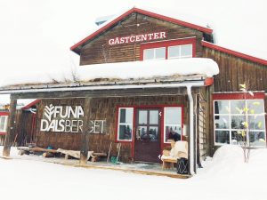 I Gästservice serveras fika framför brasan medan snön yr utanför. Bland annat Belgiska våfflor och choklad.